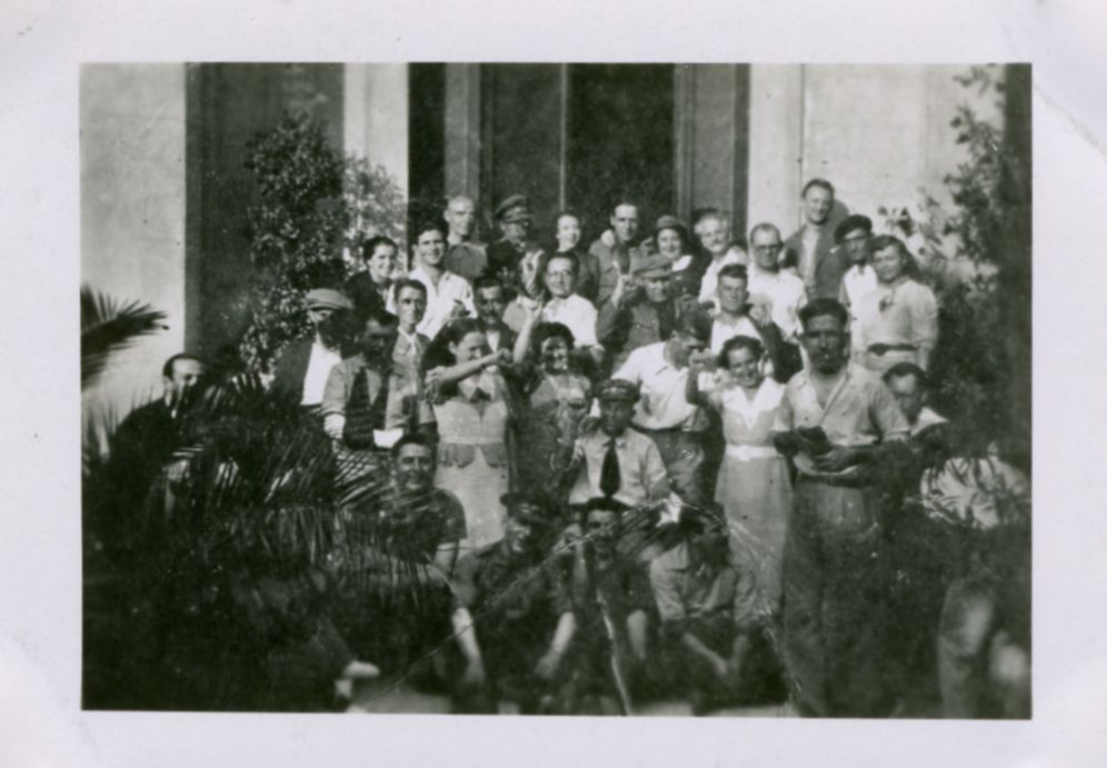 Spagna. ritratto di gruppo di volontari combattenti e civili, uomini e donne, tra le piante in un giardino all'esterno di un edificio