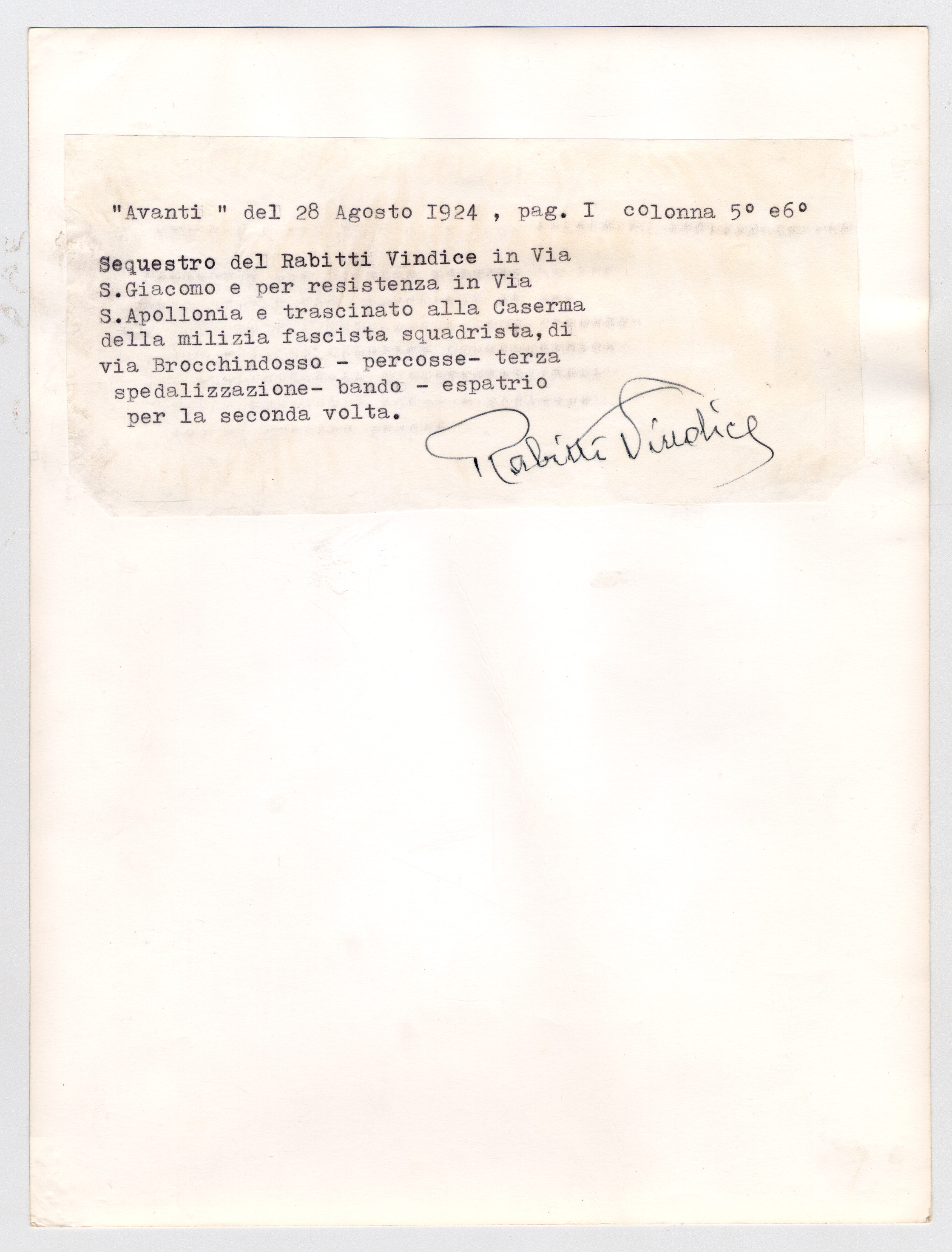Testo sul retro della foto: \\\"Avanti del 28 agosto 1924, pag I colonna 5° e 6° Sequestro del Rabitti Vindice in Via S. Giacomo e per resistenza in Via S. Apollonia e trascinato in Caserma della milizia fascista squadrista , di via Brocchindosso - percosse - terza spedalizzazione - bando - espatrio per la seconda volta (firma): Rabitti Vindice